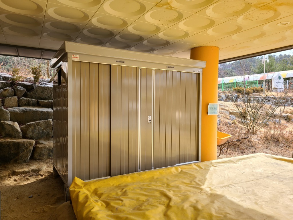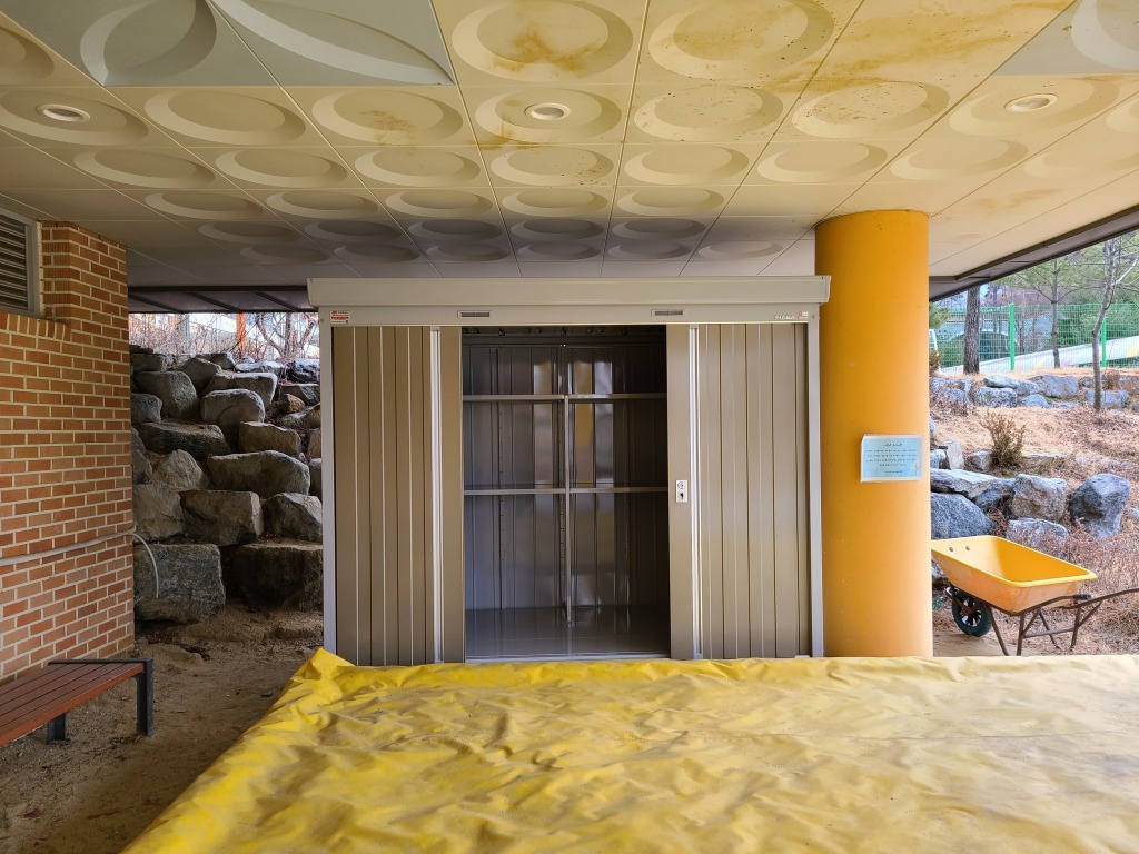 원주시 혁신로에 위치한 초등학교 내 유지원 물품 보관용창고NXN-36S 2630* 1370* ( 1.09평 ) 멜란지 브라운 ( MB ) 색상의 문 입니다.