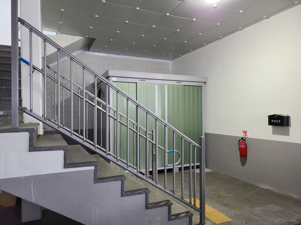 수성구 파동 전원주택단지 보관용 조립식창고 NXN-50H 2630* 1790* 2375* ( 1.43평 ) 크기이며, 그린 ( OG )색상의 문 입니다.