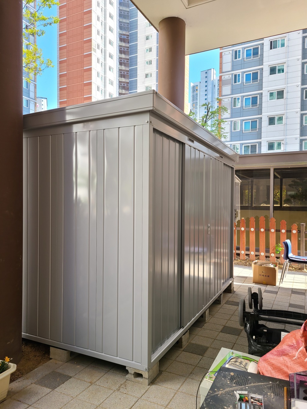 양산 아파트 안 어린이집 물품보관용 조립식창고 NXN-55S 3050* 1790* ( 1.65평 )크기이며, 실버( FS ) 색상의 문 입니다.