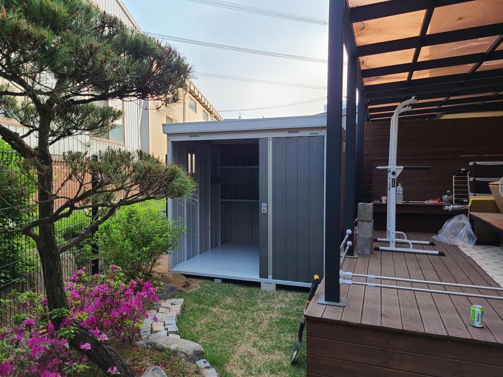파주시 운정동 고급빌라 안 보관용 조립식창고 NXN-48S 2210* 2210* ( 1.48평 )크기이며, 피리미엄 그레이 (PG) 색상의 문 입니다.